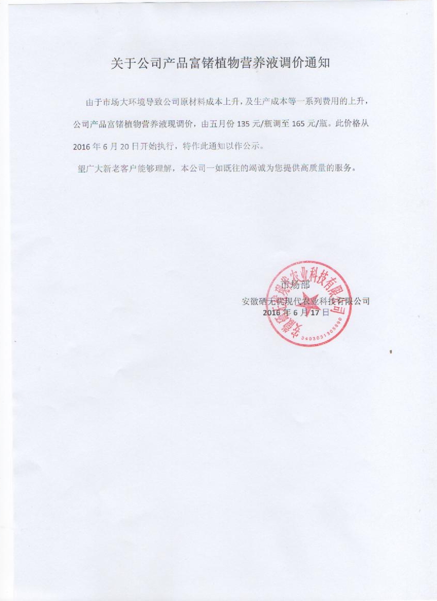 關(guān)于公司產(chǎn)品富鍺植物營(yíng)養(yǎng)液調(diào)價(jià)通知